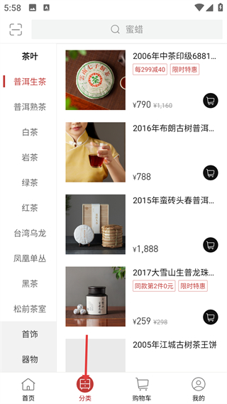 3、分類頁,聚焦茶葉品類并細分類型,展示對應商品及限時優惠,支持直接加入購物車,便于精準篩選所需商品。