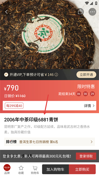 4、茶餅詳情頁,展示商品圖與特惠價,說明其為茶廠復產之作具收藏價值,支持加入購物車或直接購買。