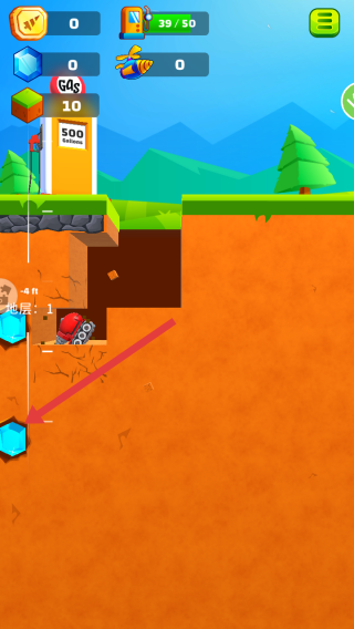 1、進入游戲,操控鉆探設備地下挖掘,收集藍色的礦石等資源,同時注意上方的加油站等場景元素,合理規劃挖掘路線。