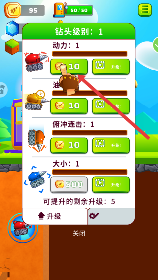 4、進入升級界面,可花費金幣升級鉆頭的動力、油耗、俯沖沖擊、大小等屬性,提升鉆探設備的性能,更高效地進行挖掘。