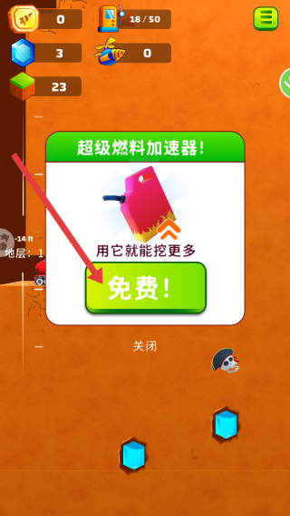 2、挖掘過程中,會彈出超級燃料加速的提示,點擊免費獲取該道具,利用它提升挖掘效率,挖掘更多資源。