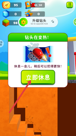 3、當鉆頭變熱時,會出現鉆頭在變熱的提示,點擊立即休息,讓鉆頭冷卻,以便后續能更快挖掘。