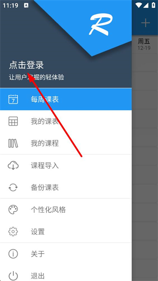 4、點擊菜單按鈕可展開功能列表,包含每周課表、我的課表等選項,還有課程導入、備份課表等功能,點擊點擊登錄可完善賬號體驗更多服務。
