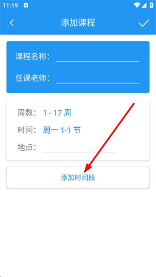 3、進入添加課程頁面,需填寫課程名稱、任課老師,周數默認為1到17周,時間為周一1節,還可補充地點,點擊添加時間段可增加課程時段。