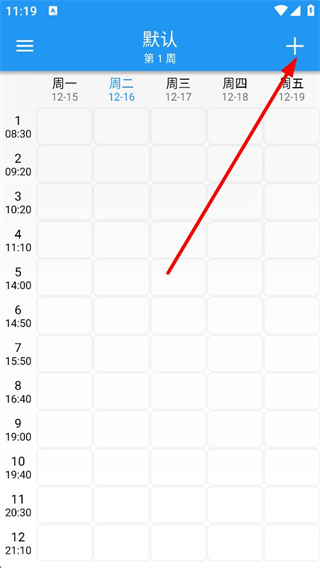 2、進入默認課表界面,能看到周一到周五的時間排期,點擊右上角加號按鈕,即可觸發添加課程的操作,完善對應時間段的課程信息。