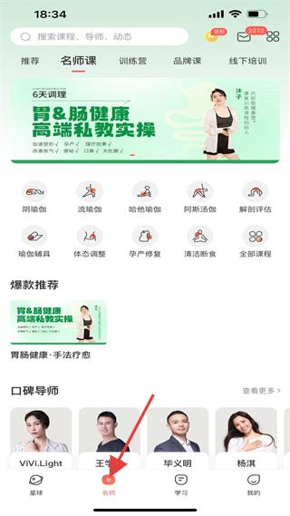 1、進入名師課頁面,可看到胃腸健康高端私教實操等推薦課程,還有陰瑜伽流瑜伽等分類入口,同時設有爆款推薦和口碑導師板塊,便于挑選合適的課程內容。