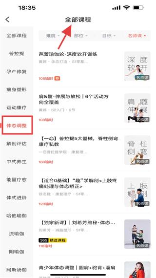 2、進入全部課程頁面,能通過難度部位目標等維度篩選課程,還有普拉提孕產修復等分類,展示各分類下的課程列表,附帶課程時長等信息。