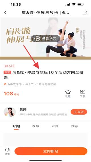 3、進入肩&髖伸展與放松課程詳情頁,可查看課程的學習次數、課時數量,了解導師信息,還能進行報名學習、收藏、下載等相關操作。