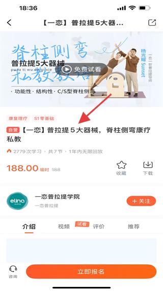 4、進入普拉提5大器械課程詳情頁,能看到課程的適用類型、學習數據,支持免費試看,可進行報名操作,同時能關注對應的普拉提學院獲取更多內容。