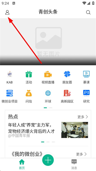 1、進入青創頭條首頁,可看到KAB活動視頻直播等功能入口,還能瀏覽熱點內容,點擊左上角頭像可展開個人功能菜單,開啟后續操作。