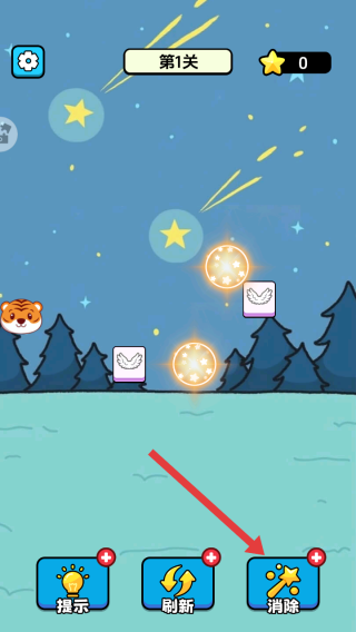 2、進入關卡后,有星星、樹林的場景里,若遇到難以消除的情況,可點擊下方消除按鈕,助力通關。