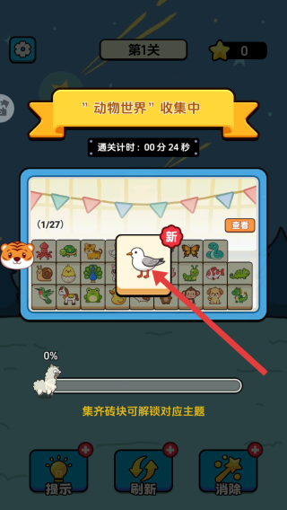3、游戲過程中,會有動物世界主題的收集界面,點擊帶有新標識的海鷗方塊,可進行收集,推進主題解鎖。