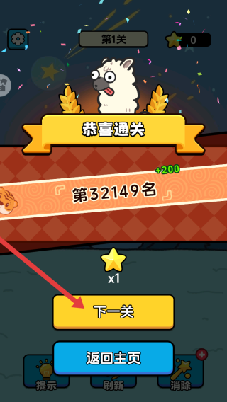 4、成功通關后,會出現恭喜通關的界面,顯示通關名次和獲得的星星,點擊下一關,可繼續挑戰新關卡。