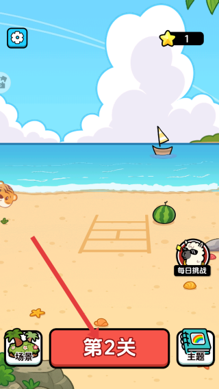 1、打開游戲,能看到海灘場景的界面,點擊第2關按鈕,即可開啟第二關的挑戰,開啟消除之旅。