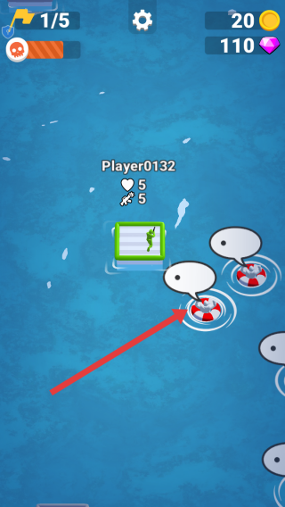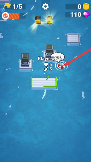 1、進入游戲,操控角色水上平臺移動,靠近救生圈等道具,可獲取幫手,同時上方顯示金幣、鉆石數量,留意資源收集。