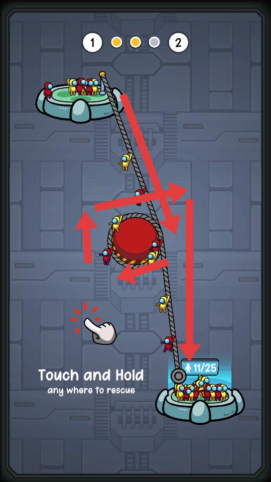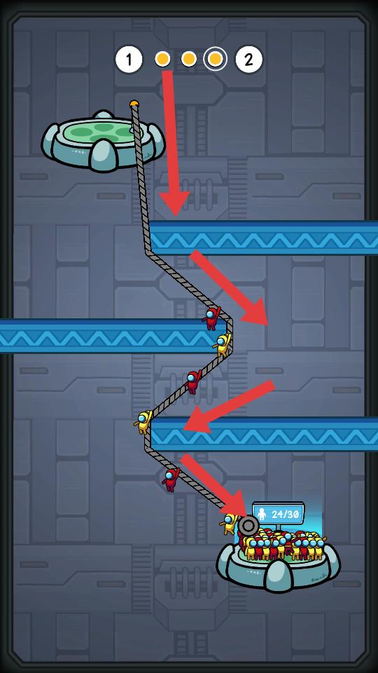 3、后續關卡,繩索路徑更復雜,有多層藍色障礙,要操控角色沿繩索繞過障礙,精準移動,不斷增加救援到下方平臺的角色數量。
