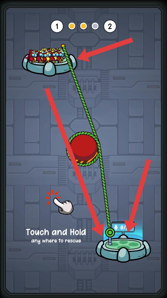 1、游戲初始,界面有繩索連接平臺,提示長按屏幕可啟動救援,讓上方平臺的角色通過繩索移動。