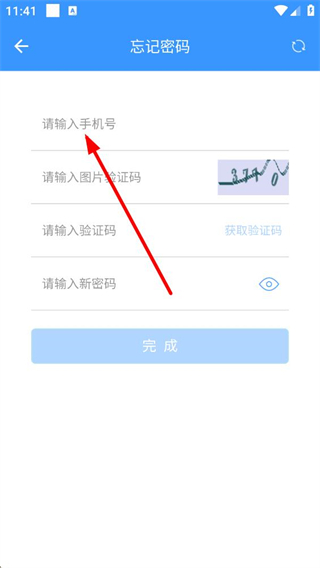 3、進入忘記密碼頁面,先輸入手機號,再填寫圖片驗證碼,點擊獲取驗證碼并填寫,設置新密碼后點擊完成,即可完成密碼重置,以便后續登錄使用。