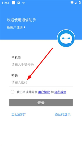 1、進入通信助手的驗證碼登錄頁面,可輸入手機號并點擊獲取驗證碼,勾選用戶協議和隱私政策后嘗試登錄,也能選擇賬號密碼登錄。