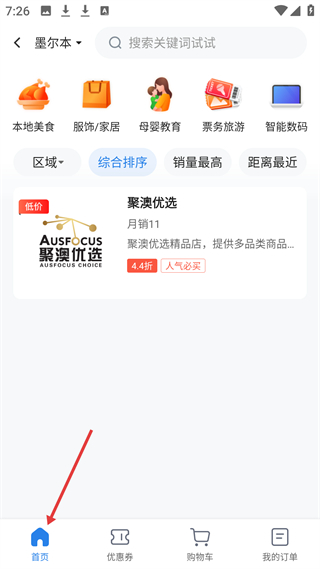 1、首頁,有本地美食、服飾家居等分類,展示聚澳優選店鋪,提供商品綜合、銷量、距離排序篩選功能。