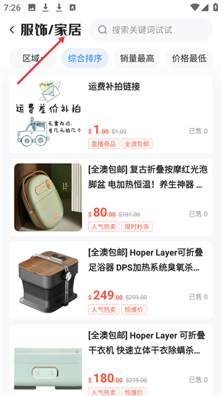 2、折扣商城服飾家居分類,展示運費補拍、按摩泡腳盆、折疊足浴器、干衣機等商品,支持全澳包郵,有直播商品、限時秒殺標簽。