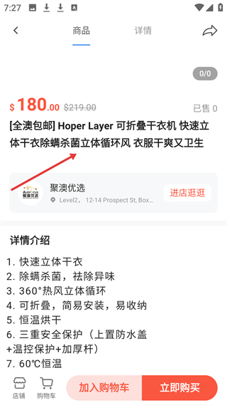 3、商城商品詳情頁,介紹Hoper Layer可折疊干衣機快速干衣、除螨殺菌等功能,支持加入購物車和立即購買操作。