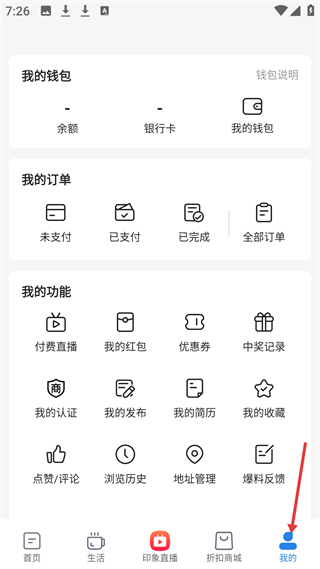 4、我的板塊,有我的錢包、訂單、功能模塊,涵蓋余額、銀行卡、訂單狀態、付費直播、紅包、優惠券等多項功能。