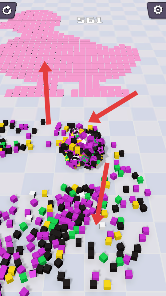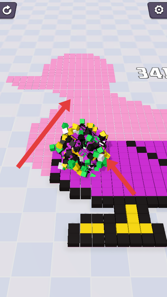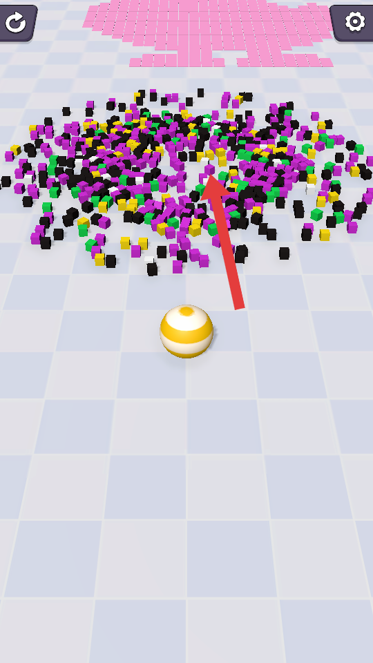 2、收集方塊過程時,持續向粉色圖案方向移動,同時不斷吸納更多彩色方塊,使球吸附的方塊越來越多,逐步靠近目標圖案。