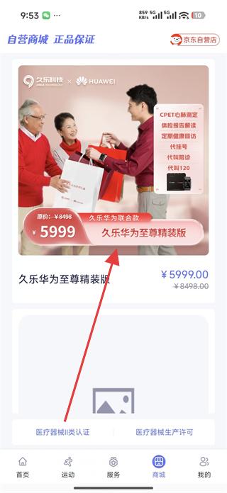 3、進入商城頁面查看久樂華為至尊精裝版等健康設備,了解設備的價格與功能,點擊購買參與健康設備的選購,提升健康監測的便利性與專業性。