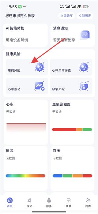 1、進入軟件首頁查看AI智能體檢的健康風險板塊,如患病風險、心律失常篩查等,了解健康監測的功能,同時可查看心率、血氧飽和度等數據,掌握自身健康狀況。