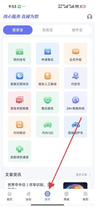 2、點擊服務進入服務頁面,瀏覽管家寶的預約掛號、申請售后等功能,以及急救寶的緊急求助客服、代叫120等服務,了解健康服務的選項,滿足健康管理需求。