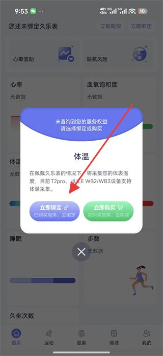 4、在健康監測功能中若需使用體溫監測,可選擇立即綁定設備或立即購買,同時可查看睡眠、步數等其他健康數據,全面管理自身健康,提升健康管理的系統性。