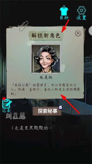 3、完成對話后解鎖新角色陳美麗,查看她的身份介紹信息,了解其相關設定,之后可點擊探索秘事繼續推進。