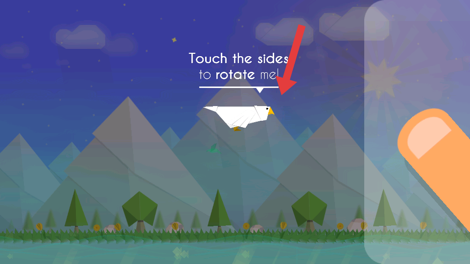 1、游戲初始,屏幕顯示文字提示,需觸摸屏幕兩側來控制白色折紙鳥旋轉,以此開啟游戲操作。