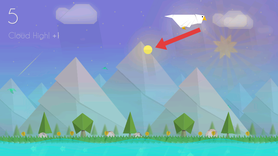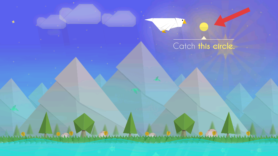 2、游戲界面提示要操控折紙鳥去捕捉畫面中的金色圓形,這是獲取分數等的關鍵操作。