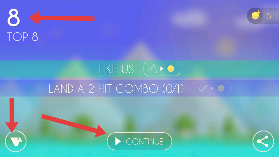 4、游戲結束后,界面顯示分數與等級,還有任務關卡,可點擊CONTINUE繼續游戲,或點擊左側圖標等進行其他操作。