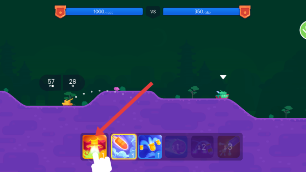 1、進入游戲對戰界面,下方有不同技能卡片,點擊選中帶火焰特效的技能卡,準備對敵方發起攻擊。