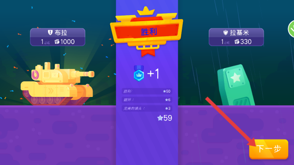 4、成功擊敗敵方后,會出現勝利界面,展示對戰雙方信息及獲得的獎勵,點擊下一步可繼續游戲。