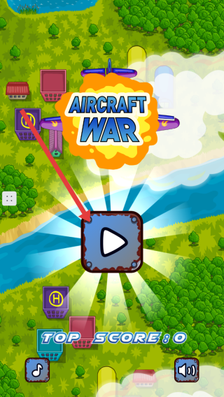 1、進入游戲,能看到帶有AIRCRAFTWAR字樣的標題界面,點擊中間帶三角箭頭的開始按鈕,即可開啟空戰。