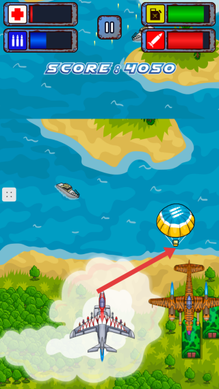 2、游戲時操控飛機,可瞄準獲取帶有降落傘的補給道具,同時躲避敵方攻擊,屏幕會實時顯示當前得分。