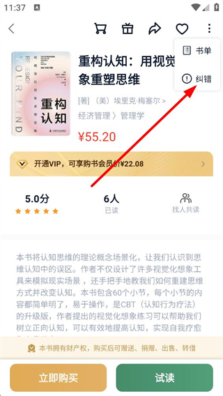 3、書籍詳情界面,點擊右上角更多選項,可看到書單糾錯等功能,根據需求選擇對應功能,可對書籍相關內容進行整理或反饋。