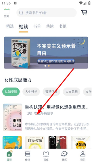 1、讀書應用首頁的她讀板塊,可瀏覽女性底層能力相關書籍,點擊重構認知用視覺化想象重塑思維書籍條目,即可進入該書的詳情界面。