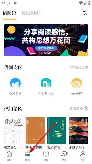 4、點擊底部借書選項,可進入借閱館界面,這里有借閱專區及熱門借閱書籍,可根據需求選擇書籍進行借閱,參與閱讀相關活動。