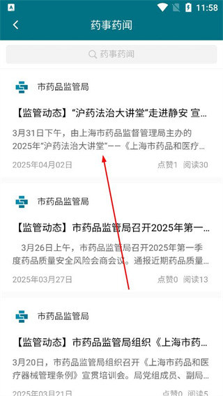 3、在藥事新聞頁瀏覽列表中的資訊條目,選擇感興趣的內容如滬藥法治大講堂相關文章,點擊該條目進入詳情頁面。