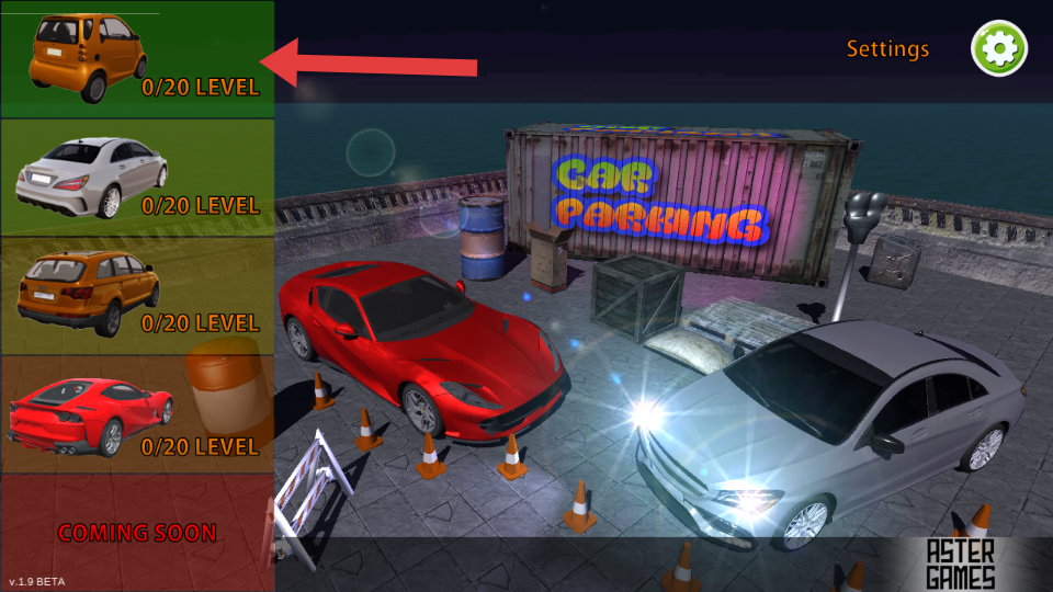 1、游戲選車界面,有多款汽車可選,比如橙色小車,顯示共有20關,點擊選擇心儀車輛,即可進入停車關卡挑戰。