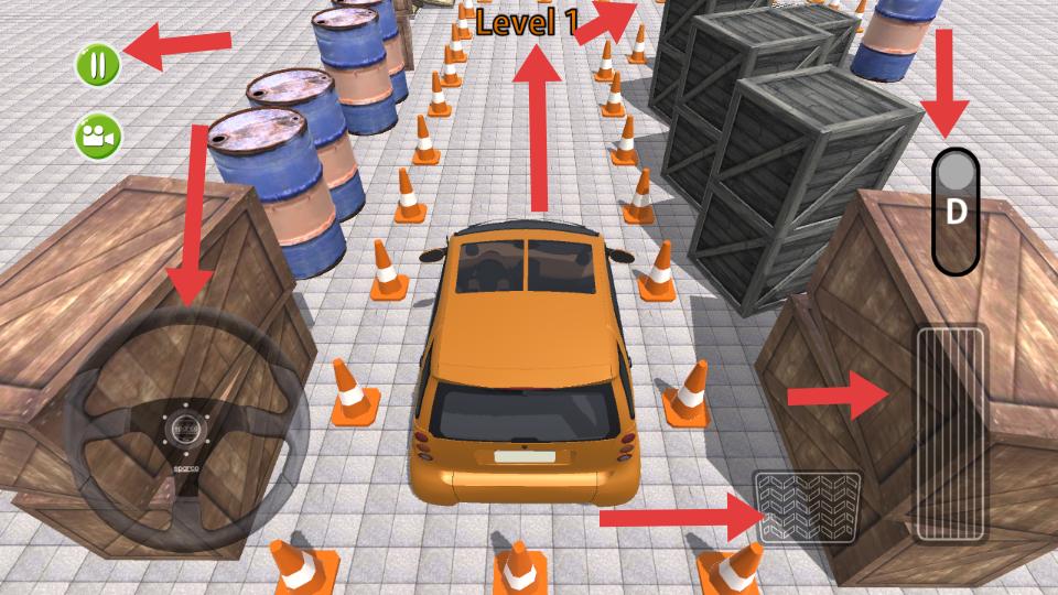2、進入關卡1,通過左側方向盤控制方向,右側操作區域控制油門等,在有油桶、木箱和路錐的場景中,小心駕駛車輛前進。