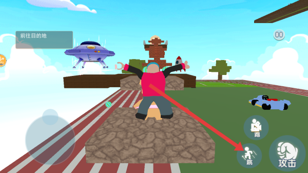 2、游戲界面操控角色,界面有跳等操作按鈕,點擊跳,讓角色跳躍,前往不同區域,探索游戲場景。