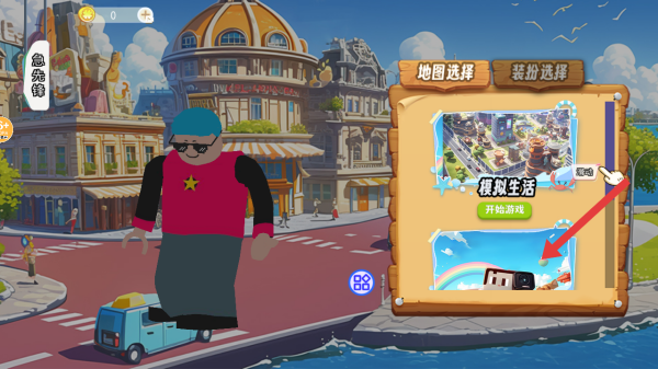 1、進入游戲,能看到帶有城市場景的界面,有地圖選擇和裝扮選擇等選項,選擇喜歡的地圖,點擊開始游戲,開啟游戲。