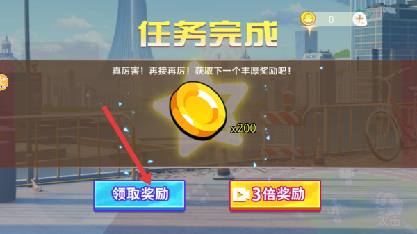 4、完成任務后,屏幕會顯示任務完成,還有領取獎勵等按鈕,點擊領取獎勵,獲取相應的游戲獎勵。