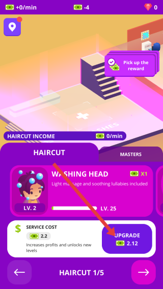 2、接著能升級洗頭服務,點擊按鈕,花費金錢提升洗頭服務等級,增加收益并解鎖新等級。